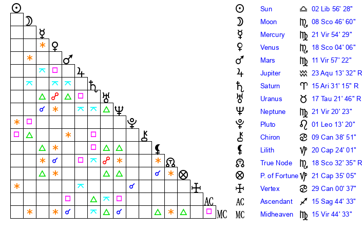 | Neptune | 21 Virgo 20 | 0 Aries 39 | 23 Virgo 20 |