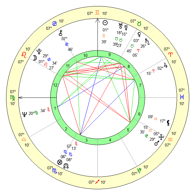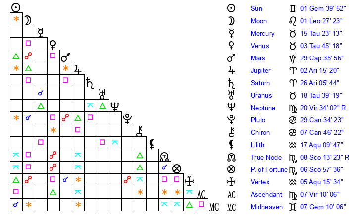 | Sun | 1 Gemini 39 | 2 Gemini 49 | 23 Leo 52 |