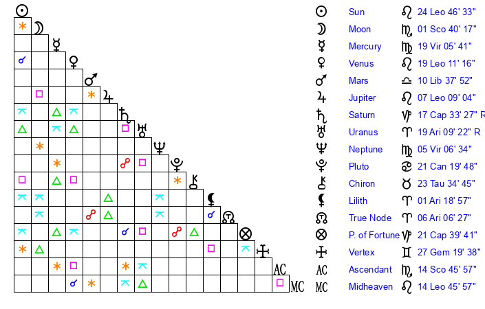 | Sun | 24 Leo 46 | 26 Leo 0 | 27 Scorpio 25 |