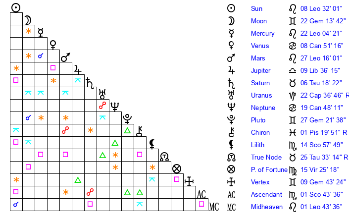 | Sun | 8 Leo 32 | 9 Leo 42 | 1 Sagittarius 33 |