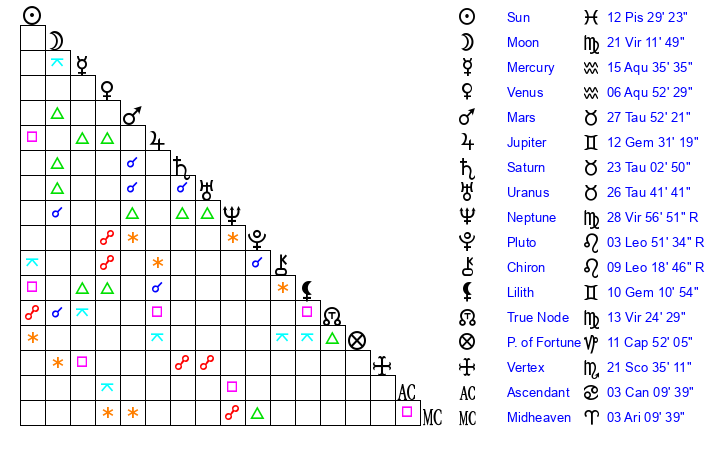 | Sun | 12 Pisces 30 | 13 Pisces 22 | 3 Gemini 50 |