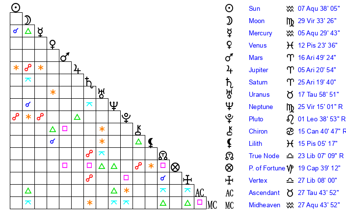 | Sun | 7 Aquarius 38 | 9 Aquarius 2 | 2 Taurus 24 |