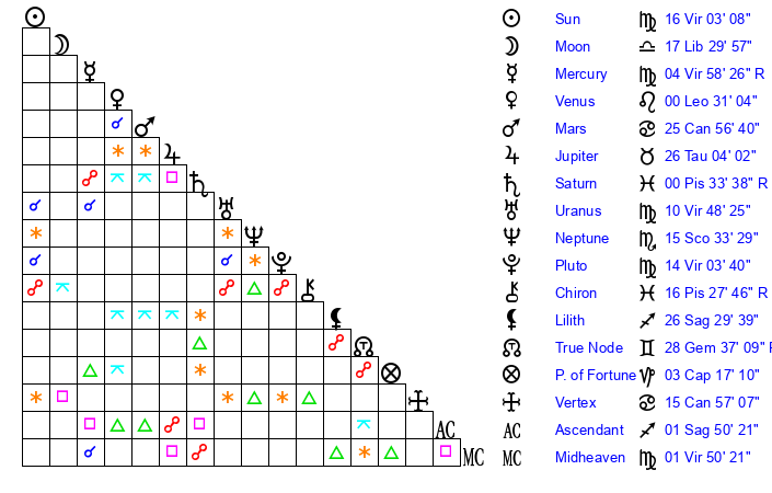 | Sun | 16 Virgo 3 | 16 Virgo 18 | 16 Scorpio 20 |
