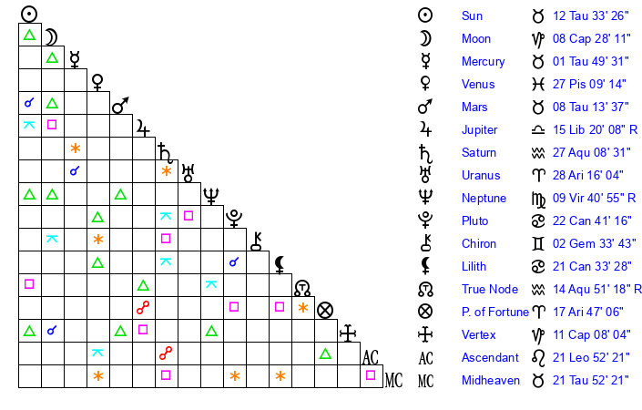| Uranus | 28 Aries 16 | 26 Taurus 29 | 1 Taurus 27 |