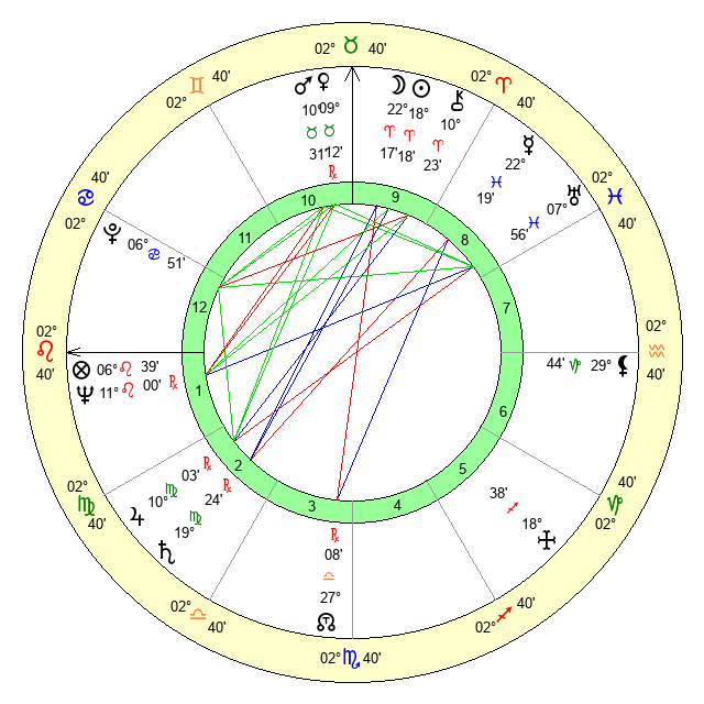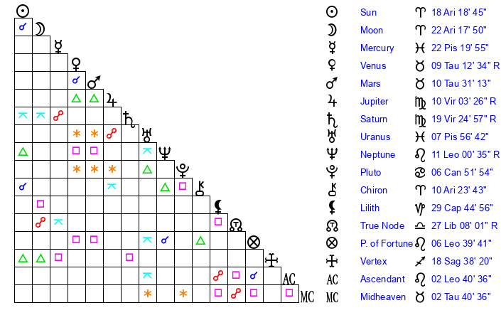 | Moon | 22 Aries 24 | 1 Virgo 40 | 16 Aquarius 58 |