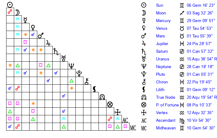 | Moon | 3 Sagittarius 34 | 29 Gemini 42 | 13 Sagittarius 46 |