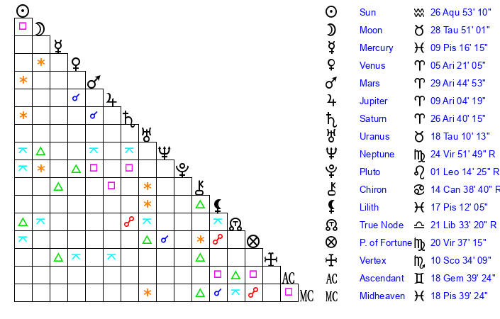 | Sun | 26 Aquarius 53 | 28 Aquarius 16 | 20 Taurus 49 |