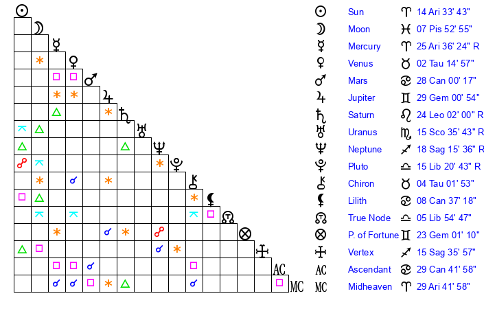 | Sun | 14 Aries 34 | 15 Aries 10 | 0 Gemini 17 |