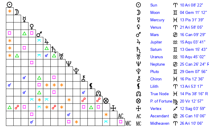 | Moon | 4 Gemini 9 | 12 Taurus 59 | 27 Gemini 43 |