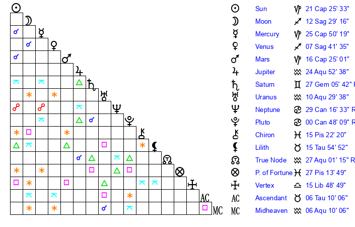 | Sun | 21 Capricorn 25 | 22 Capricorn 30 | 12 Taurus 10 |