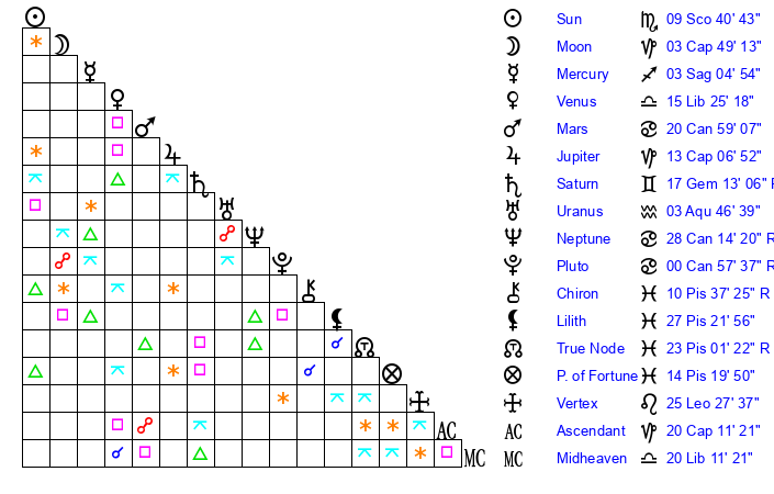 | Moon | 3 Capricorn 55 | 0 Aries 52 | 7 Aquarius 20 |
