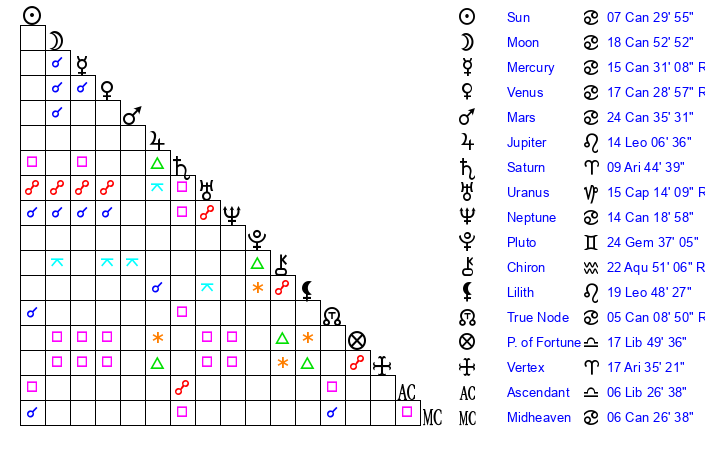 | Moon | 18 Cancer 46 | 2 Virgo 54 | 24 Libra 20 |