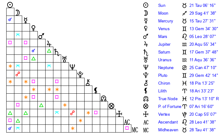 | Uranus | 11 Aquarius 34 | 27 Taurus 0 | 8 Aquarius 30 |