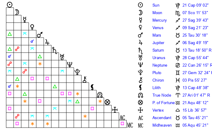 | Sun | 21 Capricorn 9 | 22 Capricorn 30 | 14 Taurus 48 |