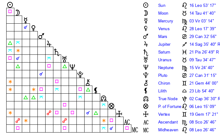 | Moon | 14 Taurus 35 | 22 Aquarius 9 | 21 Leo 40 |