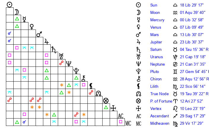 | Sun | 18 Libra 29 | 19 Libra 37 | 14 Aquarius 47 |