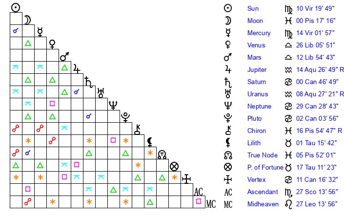 | Mercury | 14 Virgo 2 | 2 Virgo 12 | 23 Sagittarius 42 |