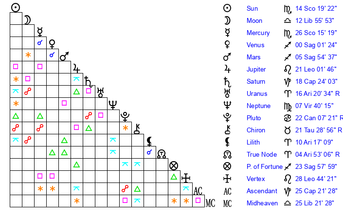 | Sun | 14 Scorpio 19 | 15 Scorpio 32 | 19 Aquarius 45 |