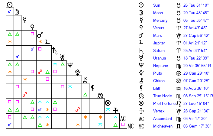| Moon | 20 Taurus 53 | 6 Aquarius 4 | 14 Cancer 16 |