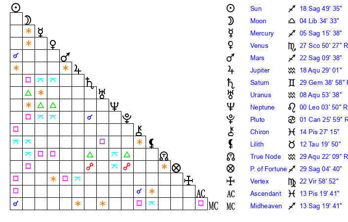 | Sun | 18 Sagittarius 50 | 19 Sagittarius 54 | 10 Aries 53 |