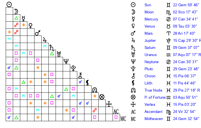 | Sun | 23 Gemini 0 | 23 Gemini 53 | 10 Libra 51 |