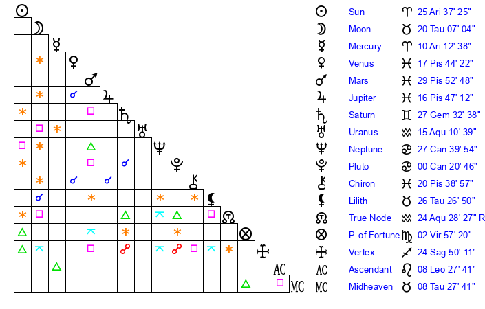 | Moon | 20 Taurus 4 | 7 Sagittarius 6 | 1 Gemini 10 |
