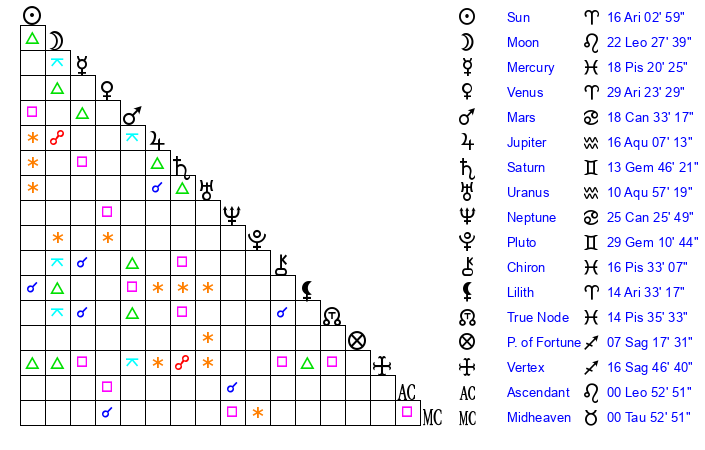 | Sun | 16 Aries 3 | 17 Aries 8 | 2 Leo 50 |
