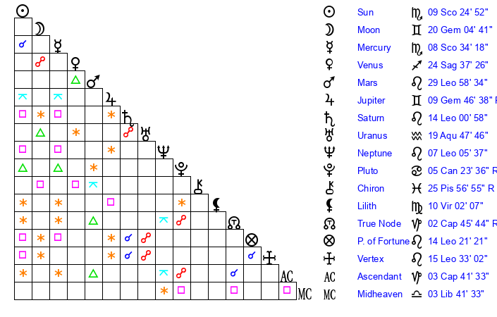 | Moon | 20 Gemini 3 | 26 Pisces 40 | 3 Gemini 37 |