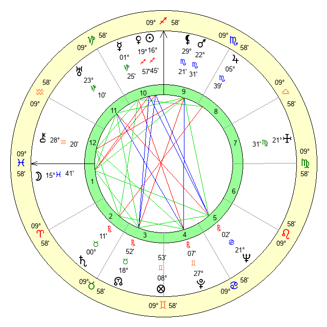 | Moon | 15 Pisces 44 | 21 Leo 57 | 9 Gemini 10 |