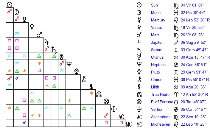 | Venus | 18 Virgo 29 | 2 Leo 25 | 6 Aquarius 56 |