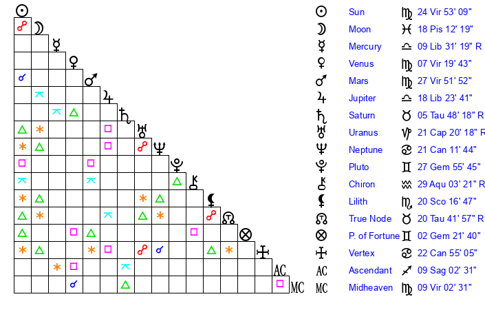 | Sun | 24 Virgo 53 | 26 Virgo 2 | 20 Capricorn 23 |