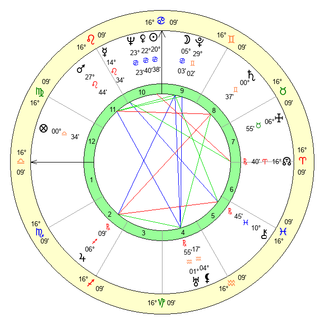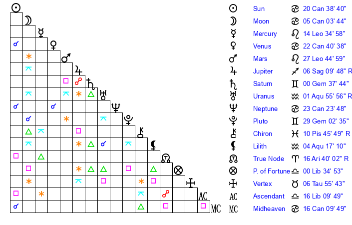 | Moon | 5 Cancer 2 | 22 Aquarius 56 | 27 Leo 48 |