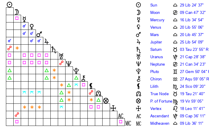 | Moon | 9 Cancer 38 | 24 Scorpio 27 | 24 Virgo 20 |