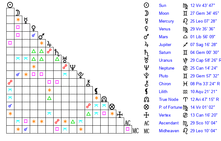 | Mercury | 25 Leo 8 | 6 Virgo 5 | 13 Sagittarius 20 |