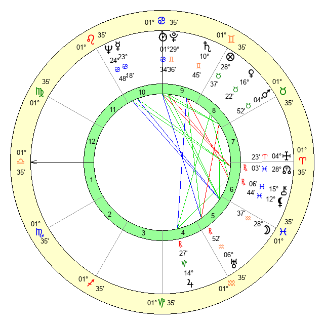 | Sun | 1 Cancer 35 | 2 Cancer 29 | 19 Libra 45 |