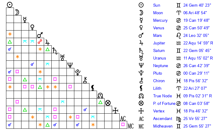 | Sun | 24 Gemini 40 | 25 Gemini 48 | 11 Libra 36 |