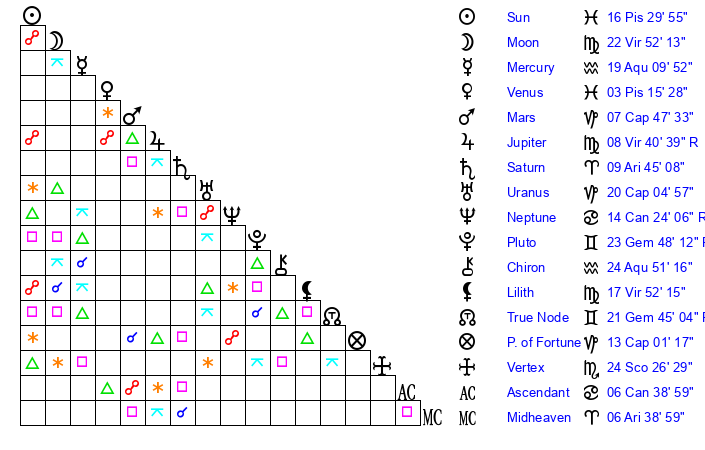 | Sun | 16 Pisces 30 | 17 Pisces 22 | 9 Cancer 11 |