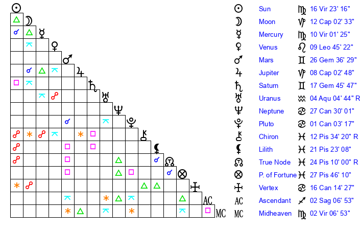 | Sun | 16 Virgo 23 | 17 Virgo 16 | 8 Capricorn 25 |
