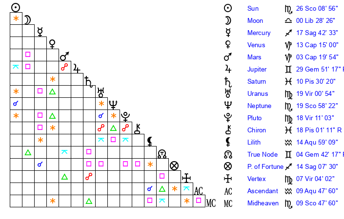 | Sun | 26 Scorpio 9 | 26 Scorpio 51 | 26 Capricorn 8 |