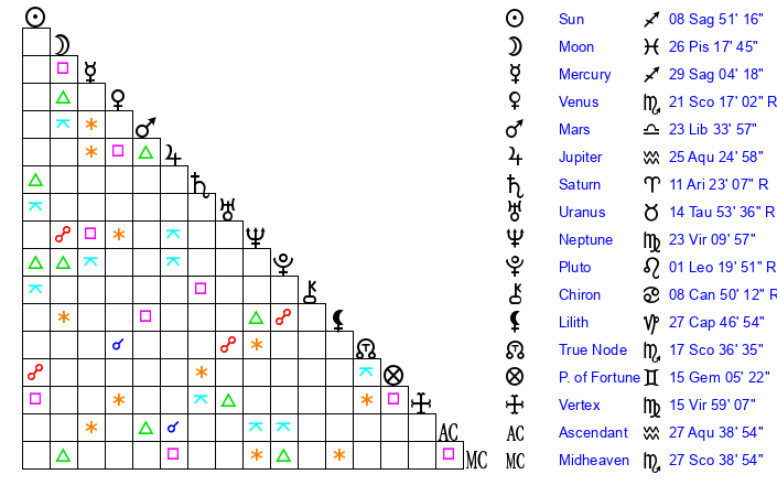 | Sun | 8 Sagittarius 51 | 9 Sagittarius 45 | 7 Pisces 12 |