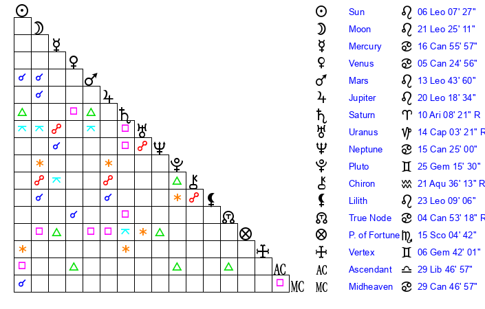 | Moon | 21 Leo 25 | 5 Libra 49 | 28 Scorpio 34 |