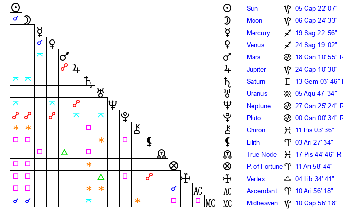| Moon | 6 Capricorn 24 | 5 Aries 7 | 13 Aquarius 50 |