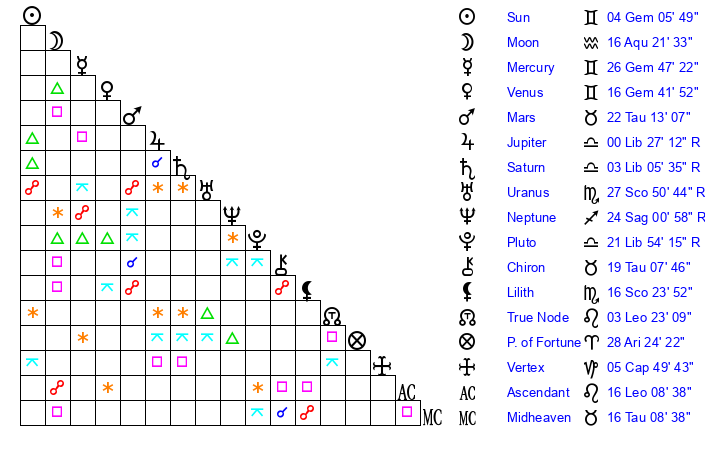 Moon | 16 Aquarius 15 | 10 Taurus 19 | 8 Libra 30 |