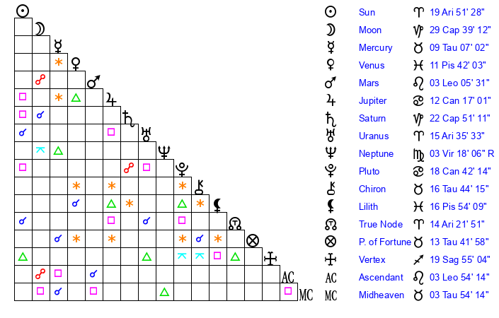 | Sun | 19 Aries 52 | 21 Aries 4 | 20 Cancer 19 |
