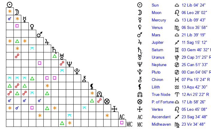 | Moon | 6 Leo 24 | 22 Pisces 50 | 2 Libra 31 |