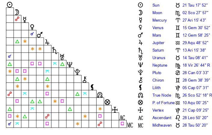 | Moon | 2 Scorpio 19 | 22 Scorpio 14 | 5 Capricorn 39 |