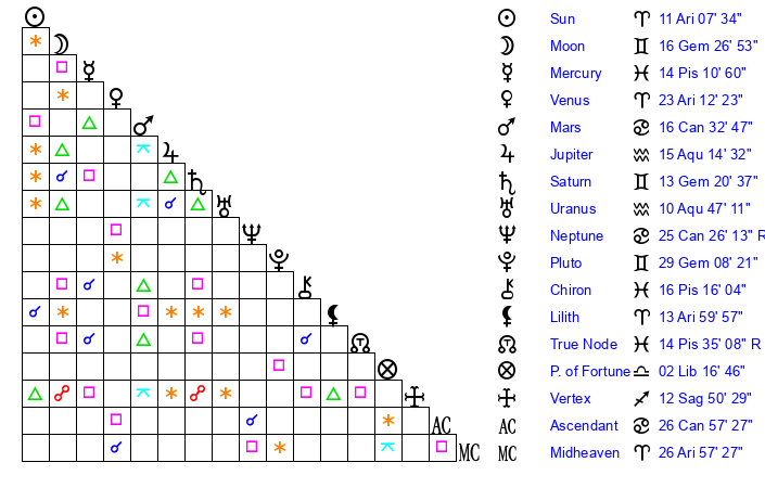 | Sun | 11 Aries 7 | 12 Aries 13 | 28 Cancer 3 |