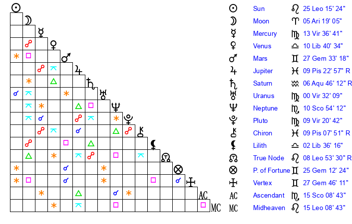 | Neptune | 10 Scorpio 53 | 1 Aries 39 | 12 Scorpio 36 |