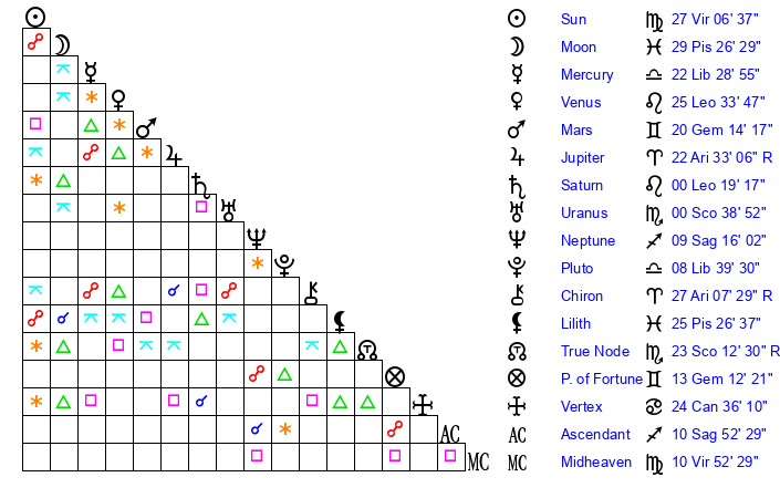 | Sun | 27 Virgo 6 | 27 Virgo 59 | 16 Scorpio 40 |