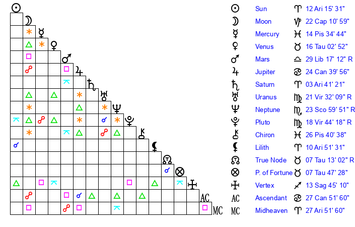 | Sun | 12 Aries 16 | 13 Aries 12 | 8 Gemini 36 |